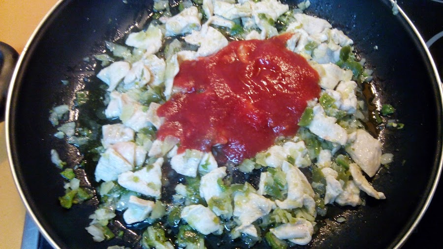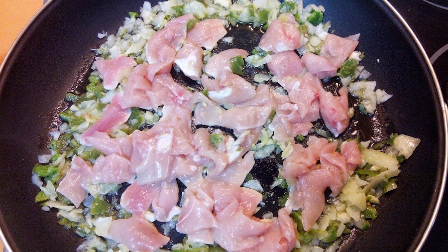 Y cuando veamos que está medio pochada la cebolla añadimos el pollo que habremos troceado en trozos ni muy pequeños ni muy grandes.