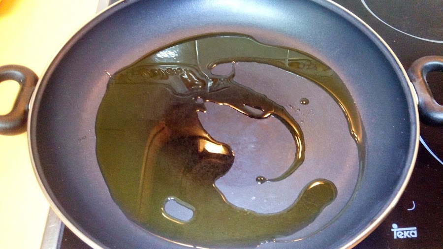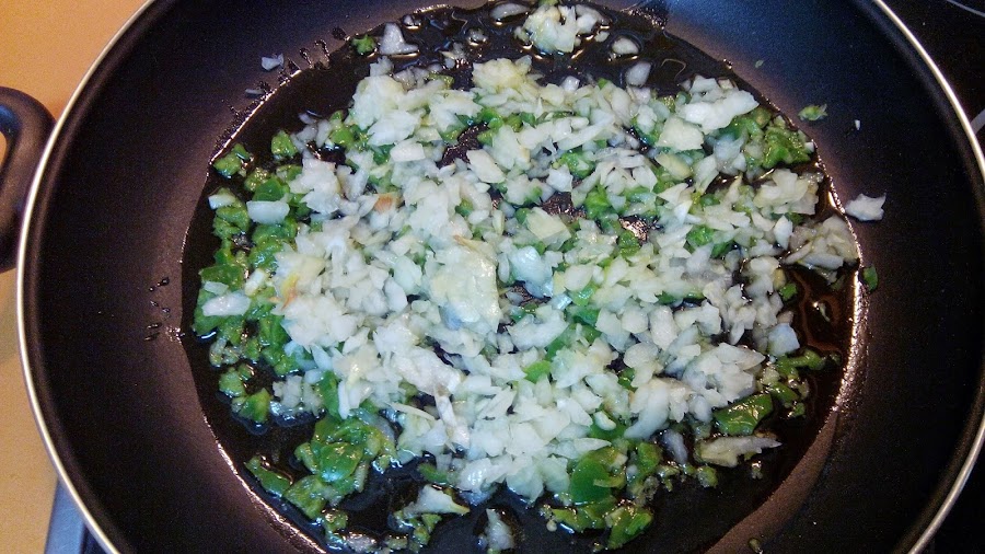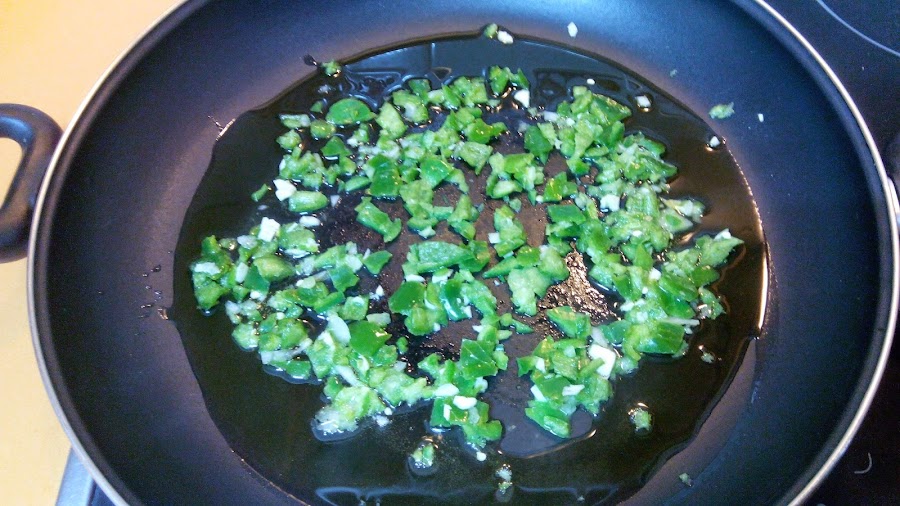 Picamos muy bien el pimiento y el ajo y cuando el aceite esté caliente los sofreímos.