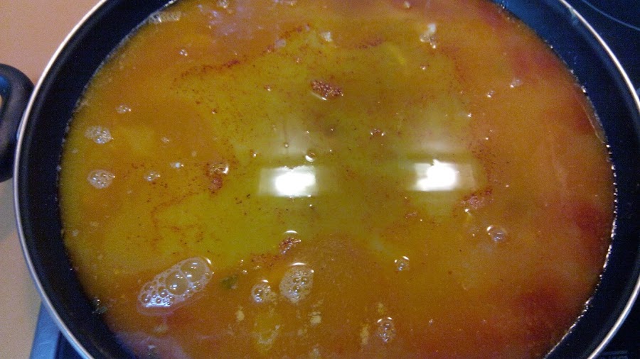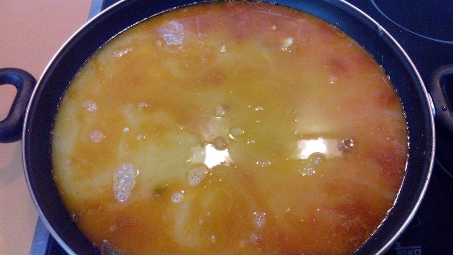 Añadimos entonces el litro de caldo de pollo y sal al gusto, sin pasarse.