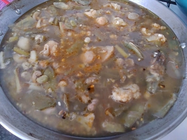 Añadimos 2 tazas del caldo preparado (sólo el líquido) y con una espumadera cogemos las verduras escurridas y se las añadimos. Removemos llevamos a ebullición y bajamos el fuego.