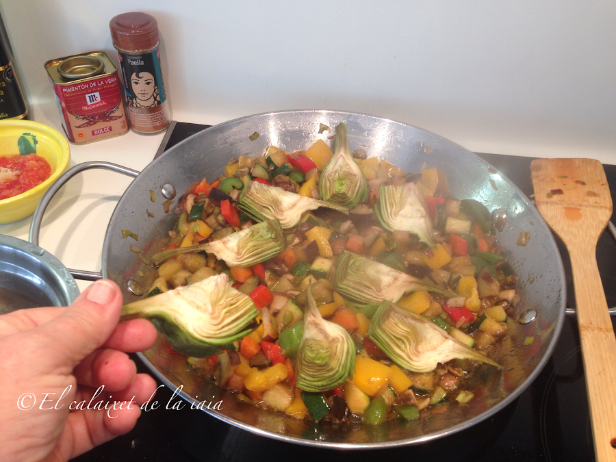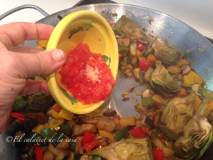 añadimos el resto de verduras limpias y troceadas menos las alcachofas, el garrofón y el tomate rallado junto a un ajito que reservaremos