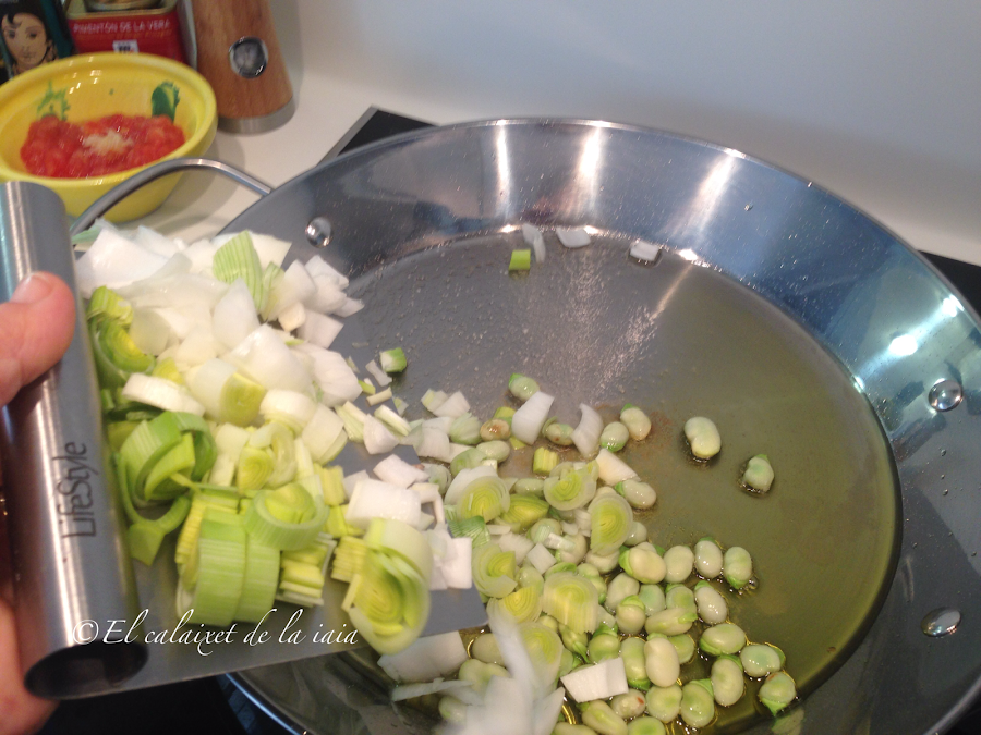 removemos y agregamos el puerro limpio y cortado en rodajas,junto a la cebolleta troceada, dejamos sofreir unos cinco minutos
