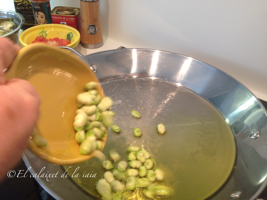 pondremos la paella al fuego, cubriendo el fondo con aceite de oliva y echando un puñadito de sal para evitar que se queme la paella e intentar que el aceite salpique menos. Removemos la sal y cuando el aceite esté caliente echamos las habas frescas.