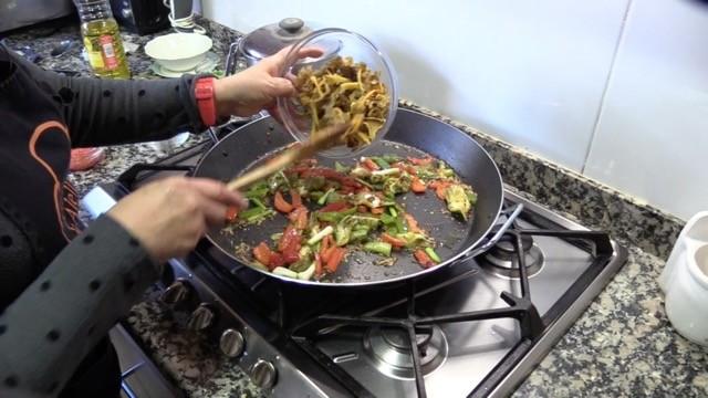 Empezaremos poniendo aceite de oliva en una paella y cuando esté caliente añadiremos los pimientos rojo y verde troceados pequeños. Removeremos y después de un par de minutos agregaremos la cebolla bien picada y sofreiremos con el fuego bajo, removiendo para que se vaya cociendo.