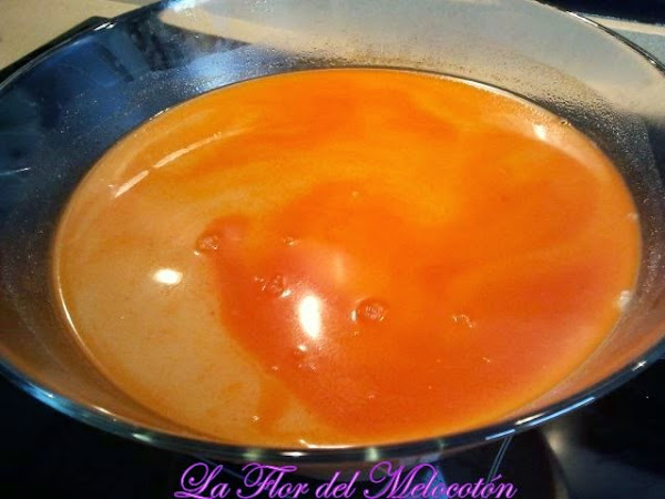 El fumet lo hice en la thermomix en tres, si queréis hacerlo podéis pinchar aquí. La única diferencia es que como ya tenía caldo de pescado hecho, no puse las cabezas ni las raspas, lo hice sólo con las gambas.
