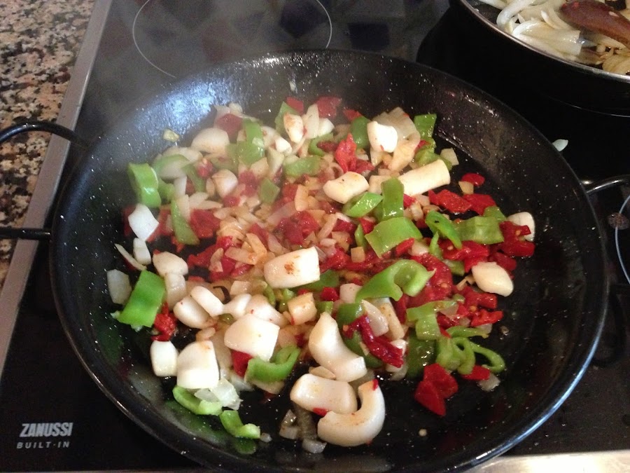 Picar la cebolla, pimientos y sofreírlos en aceite de oliva. Agregar los calamares troceados. Sofreír a fuego suave por unos 5 minutos.