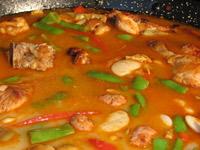 Una vez esté echa la carne, se añade la verdura y el ajo. Aquí hay que tener cuidado que no se queme ni la verdura ni la carne. Con la espumadera se reparten todos los ingredientes. Después de freírlo todo un poco se añade un poco de pimentón y tomate o fritada. Con la espumadera se mezclan y reparten bien todos los ingredientes. Es recomendable seguir un orden determinado al freír la verdura. Normalmente empezamos con la cebolla, seguido por el ajo, la fritada y finalmente las alubias y las judías.