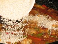 Una vez el agua o caldo esté hirviendo se puede echar el arroz. Se reparte el arroz de forma uniforme o de la forma tradicional que consiste en tirar el arroz en forma de cruz. Sea la forma que sea, a continuación se reparte el arroz con la espumadera para que haya la misma cantidad de arroz en toda la paella. Después de ésto ya no se remueve el arroz. El arroz debe quedar completamente cubierto de líquido. Si faltara un poco se añade un poco de agua o caldo a la paella.