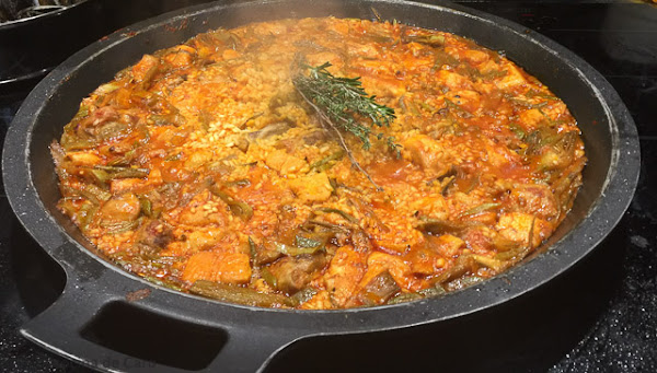 Debemos tener las judias cortadas muy finas, las alcachofas limpias y reservadas en agua con zumo de limón para que no se oxiden, el pimentón, el tomate y el pimiento en sus cuencos, no vale ir a buscarlos mientras que la estamos haciendo, el tomate rallado, la cerveza afuera, el caldo caliente y el pollo y el conejo troceados.