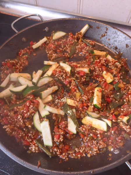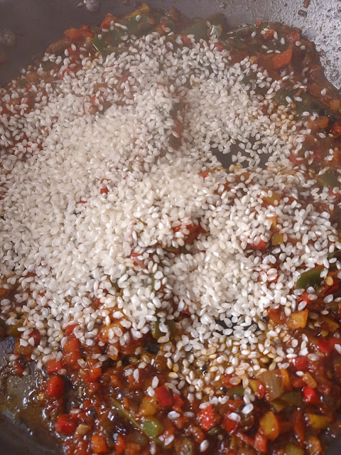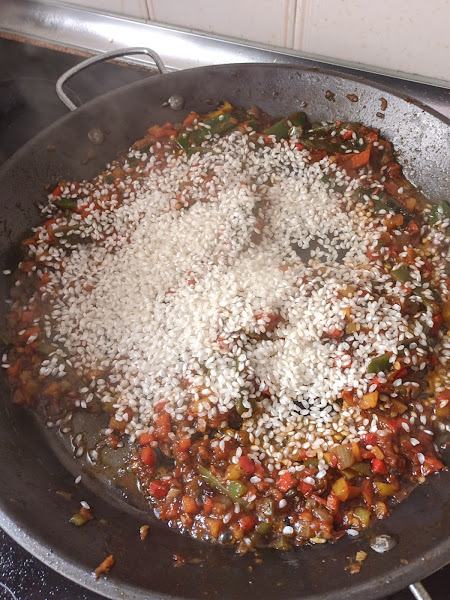 Añadir el arroz, unos 90 - 100 gr por persona, y remover para que se tueste y se cierre el grano y vaya cogiendo el sabor del sofrito.