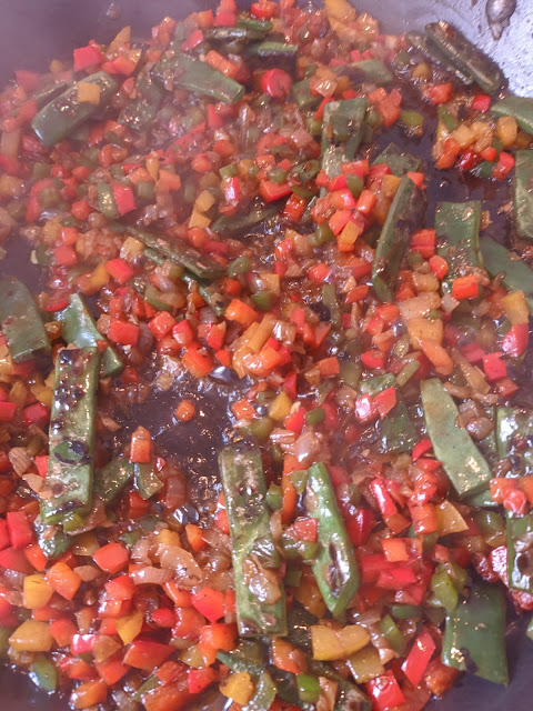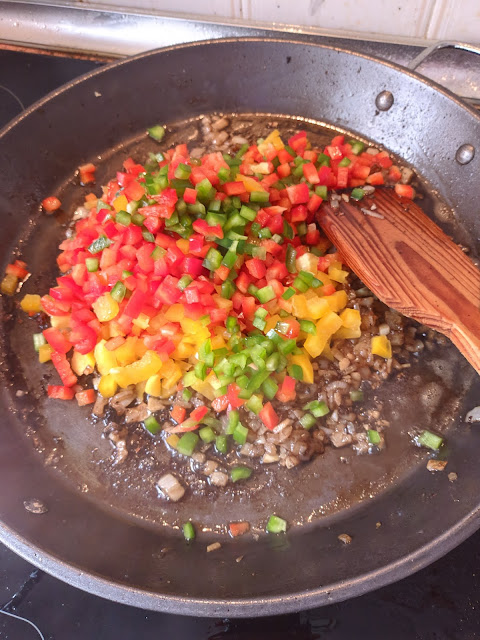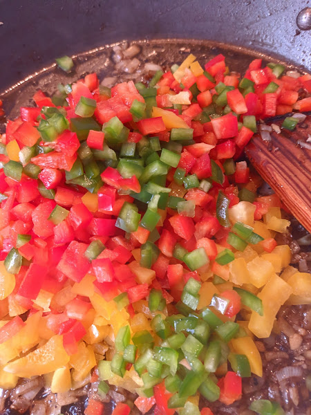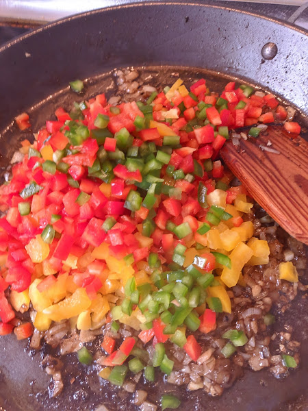 Añadir la cebolla y pochar, cuando esté pochada, añadir los pimientos y seguir pochando.