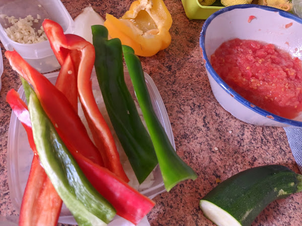 Colocar los tomates cherry y las tiras de pimiento alrededor y tapar con papel de aluminio.