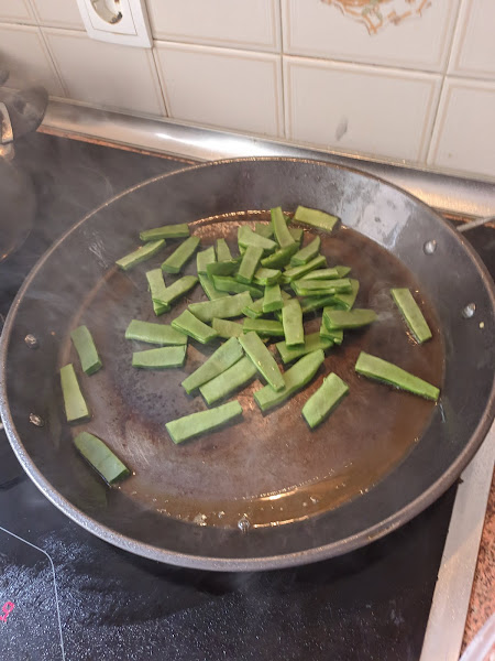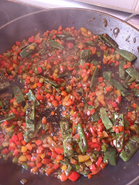 Cuando todo esté bien pochado, añadir el tomate y seguir cocinando. Cuanto más pochado, mejor. El secreto de una buena paella, está en el sofrito. Volver a añadir las vainas de judías verdes y seguir sofriendo.