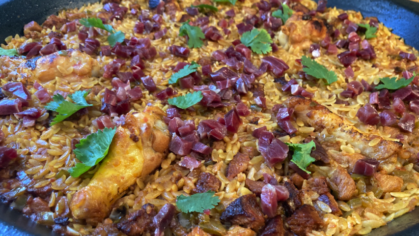 Decora con jamón ibérico picado menudo y unas hojas de cilantro fresco.