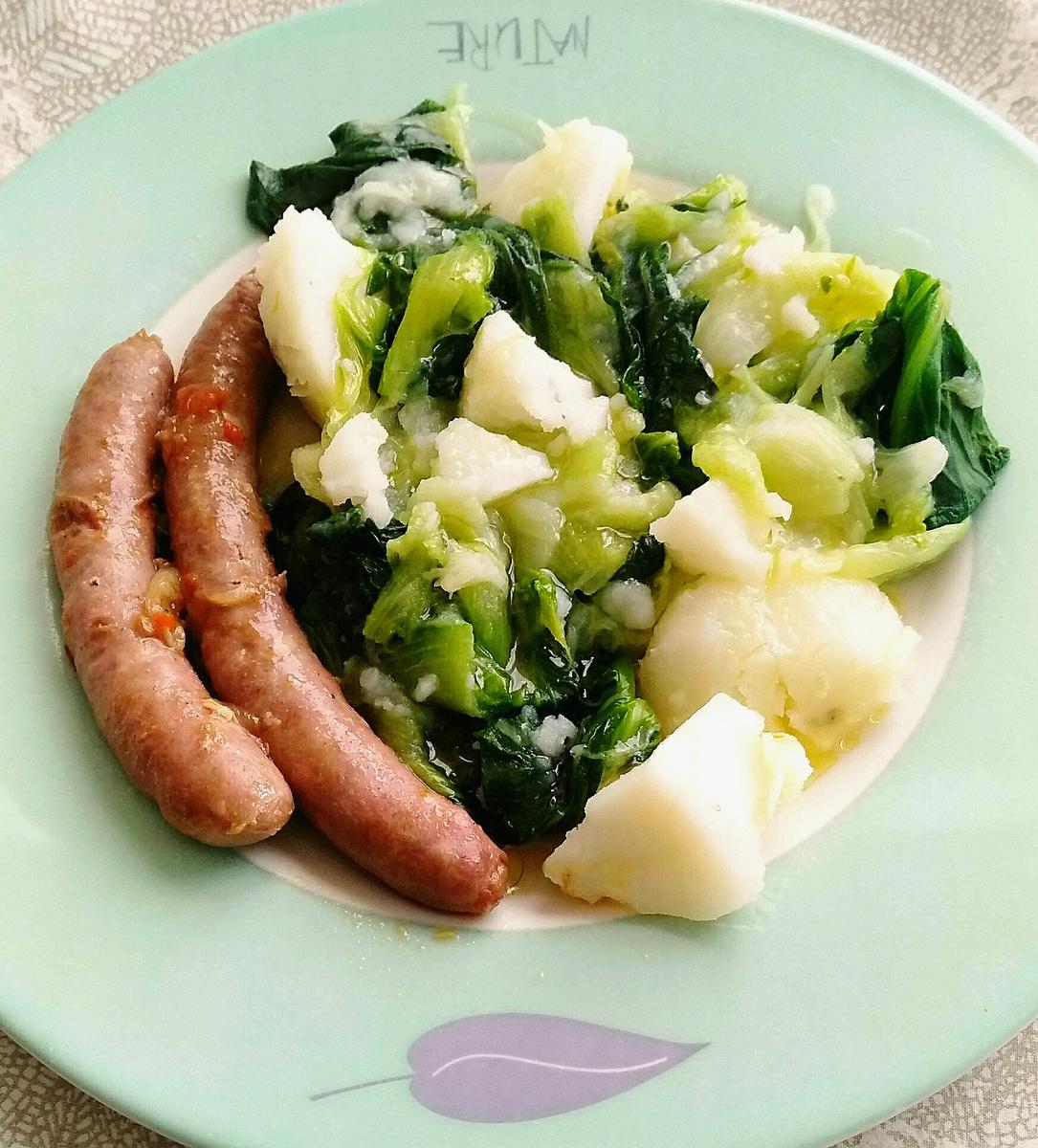 Pon agua a calentar, pela y trocea unas patatas. Hiervelas 10 minutos con un poco de sal, he incorpora los tallos unos 5 minutos. Apaga el fuego y incorpora las hojas. Trascurridos unos minutos ya tienes listo el plato de verdura. Añade un poquito de aceite de oliva.