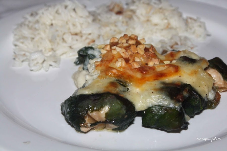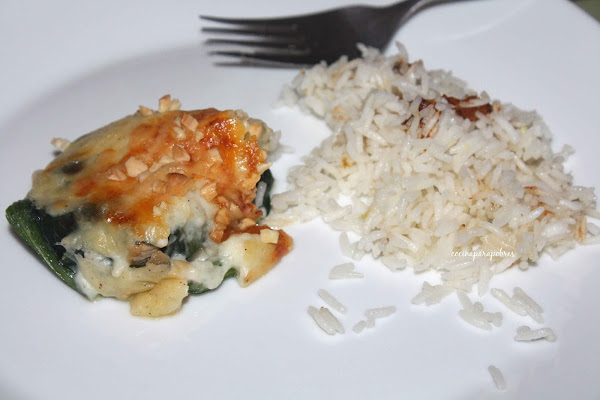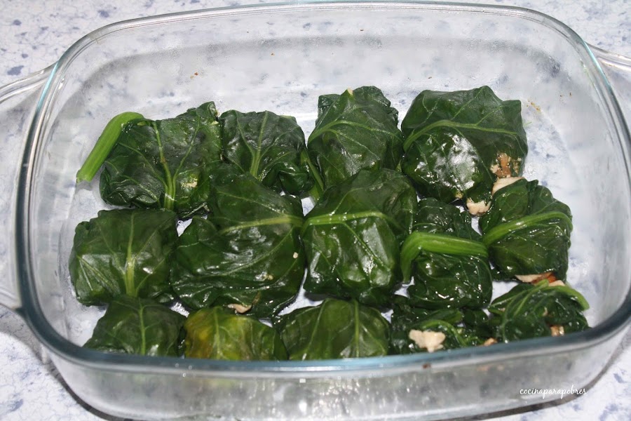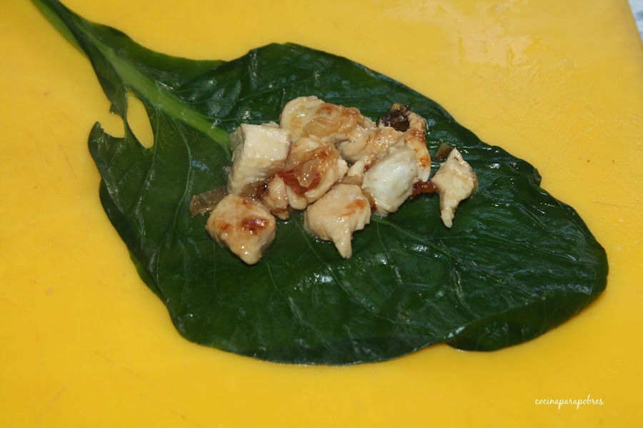 Sobre una tabla de cortar colocamos las hojas cocidas , con la ayuda de una cuchara vamos poniendo el rellenos en cada una de ellas y las cerramos como si fueran paquetitos.
