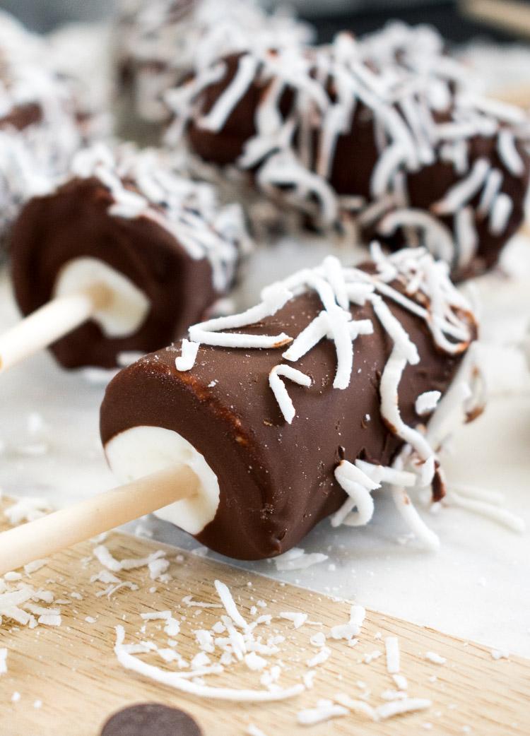 Deliciosas paletas de yogurt y coco con cobertura mágica de chocolate.