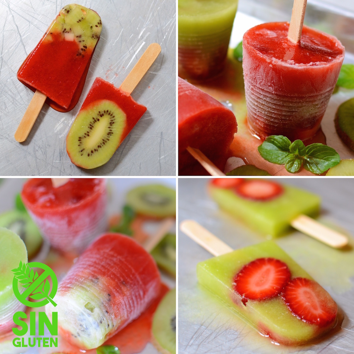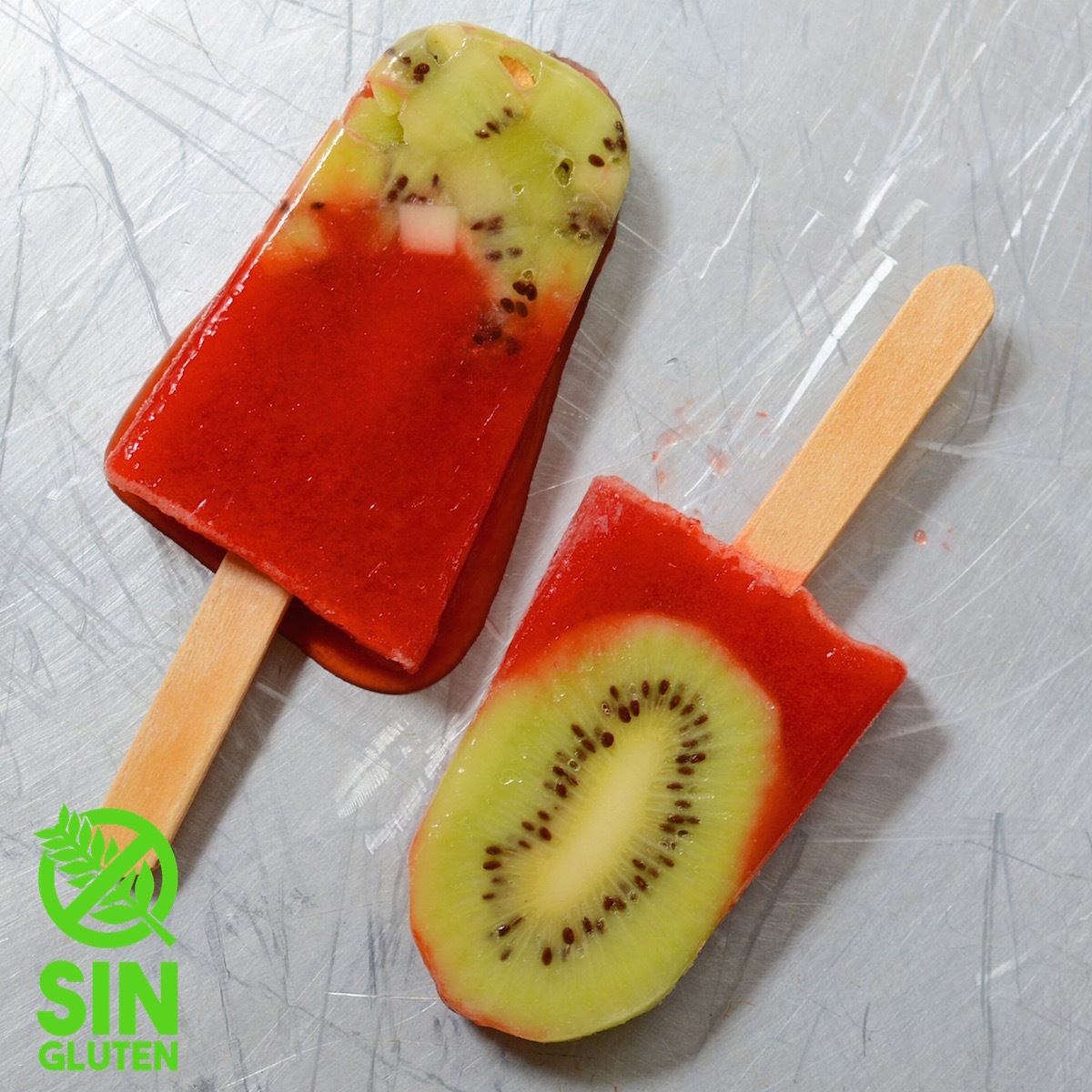 Cortar parte de la fruta en cubos pequeños o en rodajas. En el caso del kiwi antes pelarlo.El resto de la fruta procesarla cada una en forma individual en una licuadora o exprimidor de jugos.Colocar los trozos pequeños de fruta en la base de los moldes (estos ayudarán a sostener los palitos de madera).Verter el jugo de fruta, en caso de haber quedado ácido mezclar con un poco de miel (Si los trozos de fruta son de kiwi, añadir jugo de frutillas y si los trozos son de frutilla agergar jugo de kiwi).Llevar al freezer y consumir una vez estén congelados.Listo! A disfrutar!