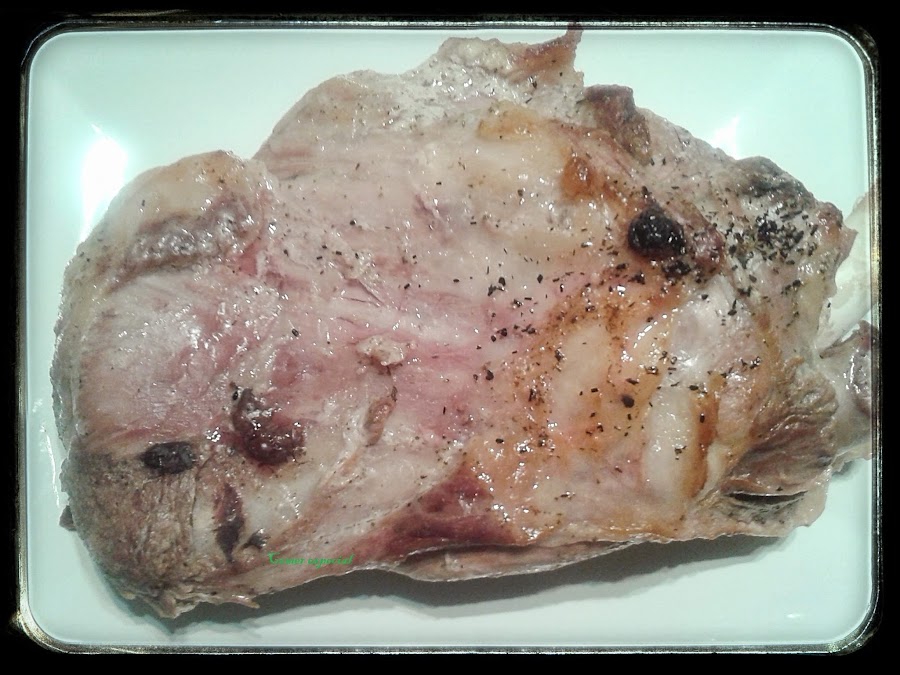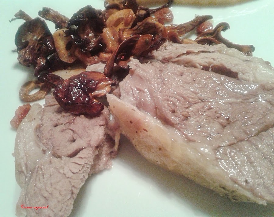 INGREDIENTES: una paletilla de cordero y un majado elaborado con sal, ajo, orégano, aceite, vino, agua. Como acompañamiento podemos usar un puré de papas (para ver receta clica aquí) y unas setas deshidratadas, previamente hidratadas, y salteadas con ajo.