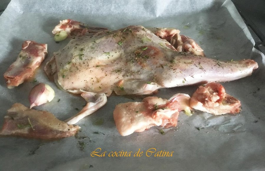 Si los recortes tuvieran demasiada grasa, eliminamos el exceso de grasa y la desechamos. Salpimentamos ligeramente la paletilla, la pincelamos con aceite de oliva con generosidad, dándole pequeños golpecitos. Salpimentamos y aromatizamos con 2 ramitas de tomillo, que frotaremos con los dedos sobre la paletilla. No tenemos que conservar las ramitas de tomillo.