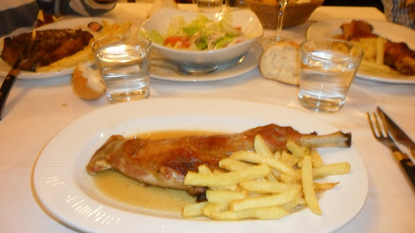 Mientras este proceso, vamos limpiando la ensalada y patatas fritas naturales peladas y cortadas a groso modo. Freímos las patatas en abundante aceite de oliva virgen extra y servimos junto con la paletilla de cordero lechal y el chuletón.