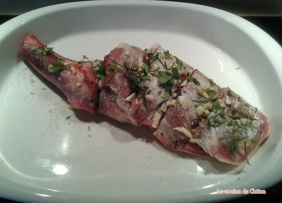 Salpimentamos, ponemos perejil muy picadito, un chorrito de aceite por encima y el vasito de vino blanco. Metemos al horno durante una hora y treinta minutos, poniendo el horno con calor arriba y abajo, (cada horno es un mundo, puede ser 15 minutos mas o menos, hasta que os guste el dorado que haya cogido).