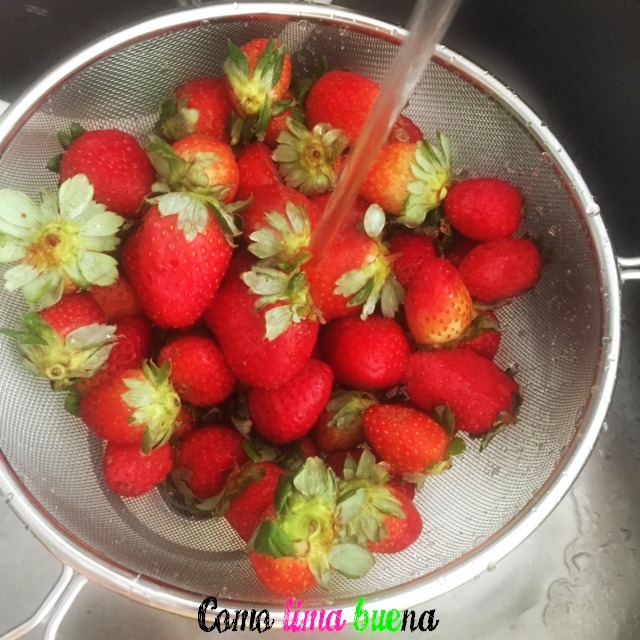 Lavamos las fresas y les cortamos los cabitos.
