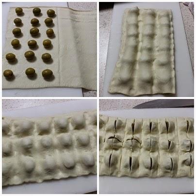 Colocamos las aceitunas en filas dejando un espacio entre ellas(ver la foto), en la mitad de la lámina de hojaldre. Tapamos con la otra mitad. Presionamos con las manos y con el dedo marcamos la separación entre las aceitunas.