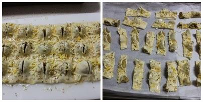 Con un cuchillo bien afilado cortamos líneas del hojaldre partiendo por la mitad las aceitunas. Hacedlo con cuidado para que las aceitunas no se salgan de su sitio. (ver la foto).