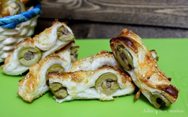 Hoy os traigo un rico y fácil aperitivo, unos palitos de hojaldre con aceitunas rellenas de anchoas.