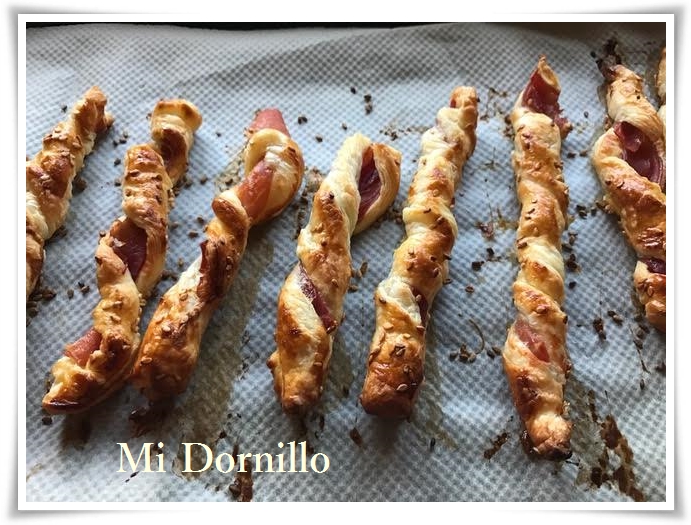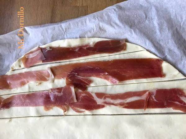 Extendemos la masa de hojaldre y la cortamos en tiritas como de dos cm. Cortamos igual las lonchas de jamón y las vamos poniendo encima de la masa de hojaldre.