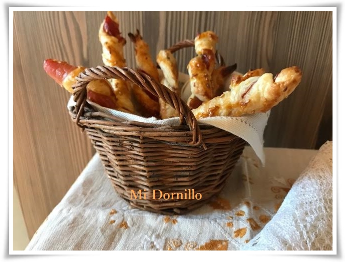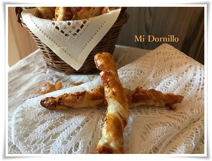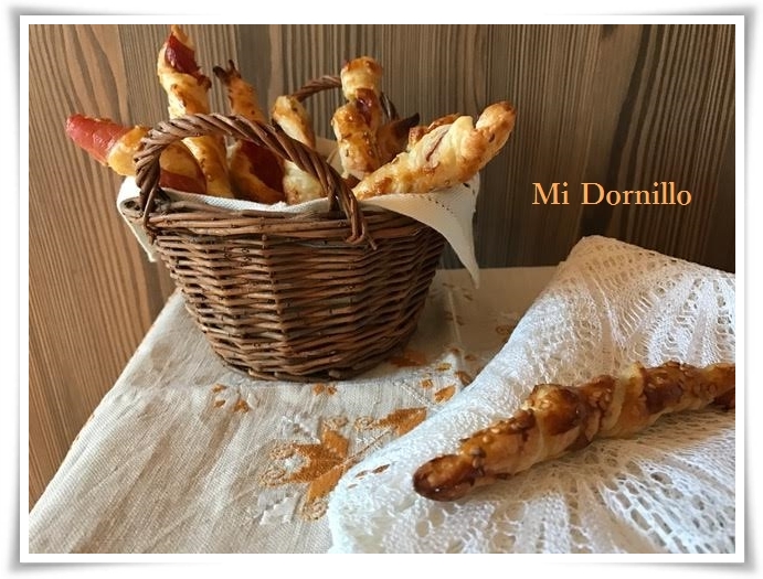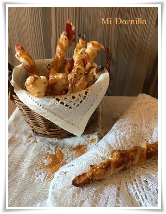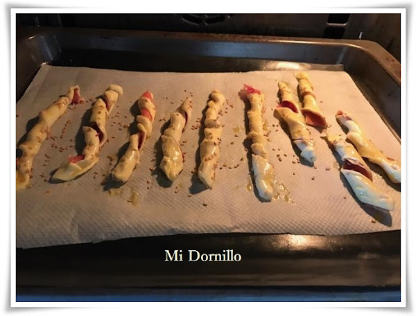 Con cada tira vamos haciendo como tirabuzones y pintamos con huevo batido, le ponemos semillas de sesamo o amapola al gusto y metemos en el horno pre-calentado a 200º sobre unos 12 o 15 minutos, según el horno, yo lo puse arriba y abajo con ventilador. Los dejamos hasta que estén doraditos.