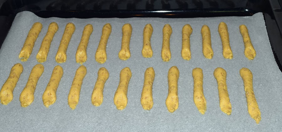 Vertemos la pasta en una manga pastelera, o, en su defecto, como he hecho yo, en una bolsa de congelar con una esquina cortada (hay que ser apañadas, no?? jeje!). Vamos formando tiras de masa encima de la bandeja del horno sobre una plancha de papel vegetal, tal que así: