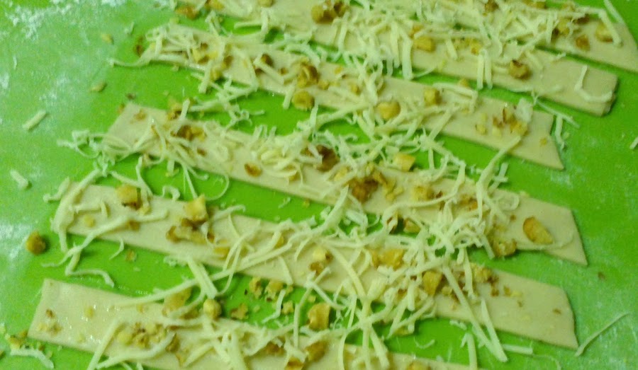 Aplasté un poquito las nueces y el queso sobre cada trocito de masa, con el rodillo, para que al envolverlos sobre sí mismos no se cayesen...