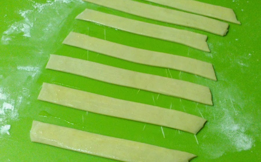 Pinté con un poco de huevo batido sobre cada tira (huevo con el que iba a preparar una tortilla... No voy a salvar la masa para tirar un huevo...)