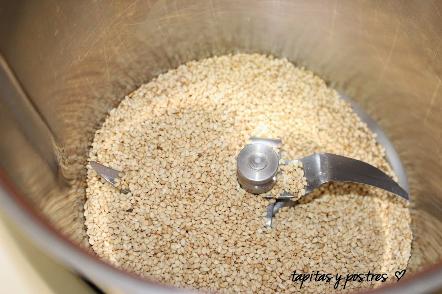 Si no tenemos thermomix podemos triturar el sésamo con una batidora eléctrica, No importa que no os quede totalmente hecho polvo.