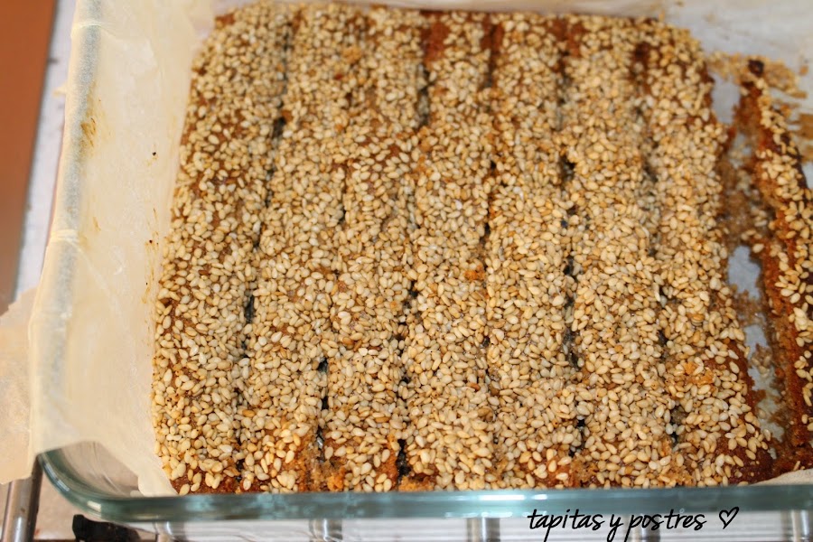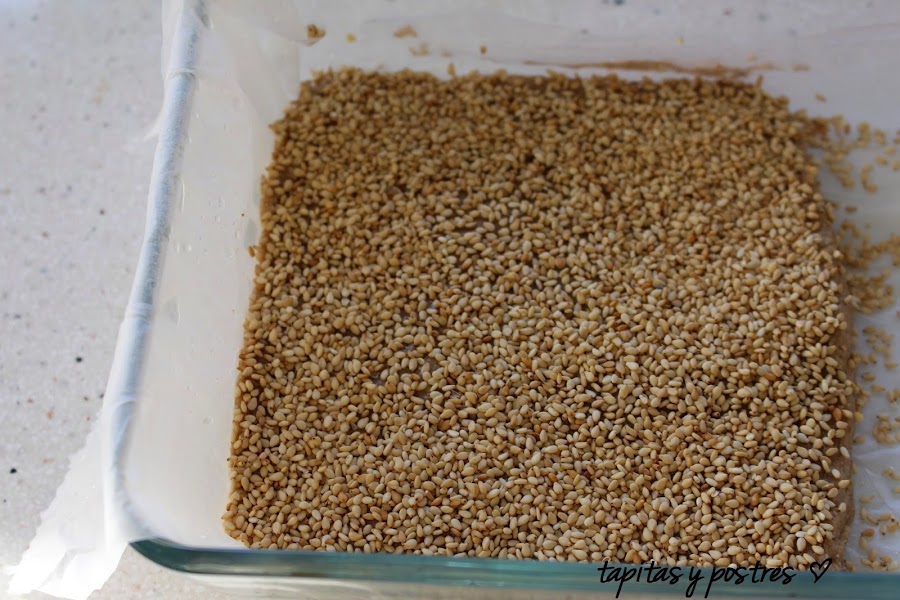 En un molde forrado con papel de horno, extendemos la pasta y damos forma para que tenga un centímetro, mas o menos de altura. Espolvoreamos el resto del sésamo por encima, que lo cubra. Al horno.
