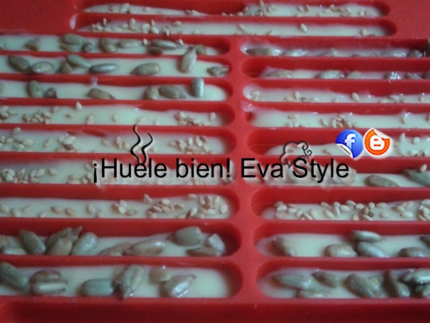 2.-Con la ayuda de una manga pastelera rellenamos el molde hasta la mitad. Esparcimos sobre ellos las semillas.