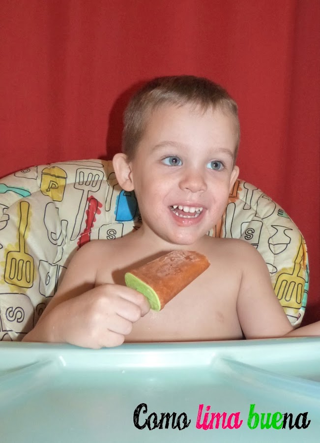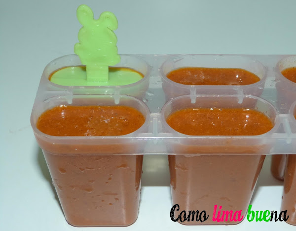 En caso de niños mayores más acostumbrados a los sabores y colores industriales, podemos añadir un poco de azúcar mascabo y colorante vegetal, para que el resultado sea más dulce y vistoso. Llenamos los moldes hasta la marca indicada, colocamos los palitos y congelamos.