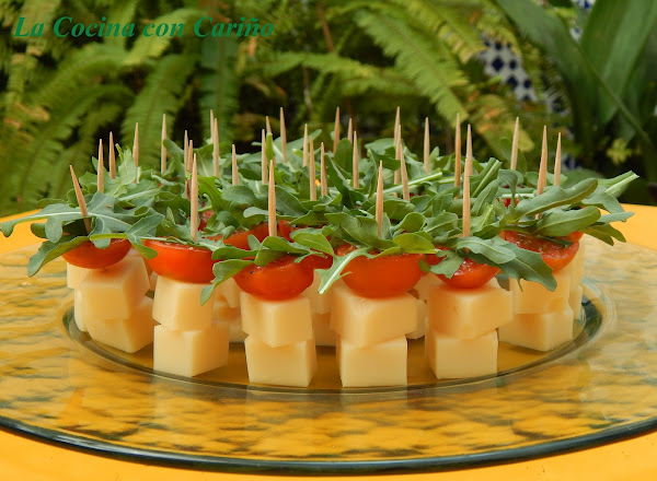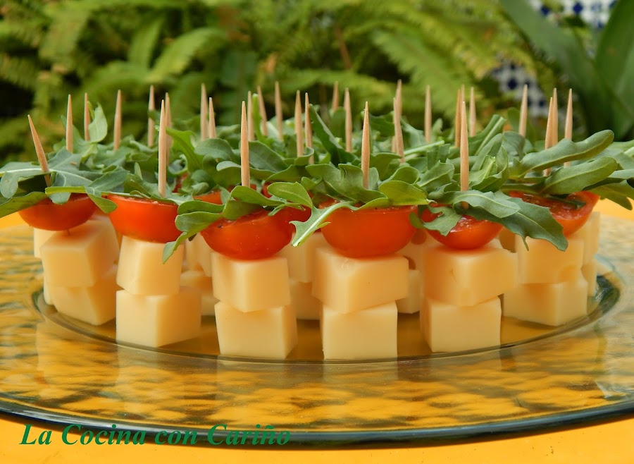 Es un aperitivo estupendo, divertido, bonito y sencillo, y además está buenísimo. No se puede pedir más. Podemos hacerlo con Cheddar, Emmental o cualquier queso de este tipo.