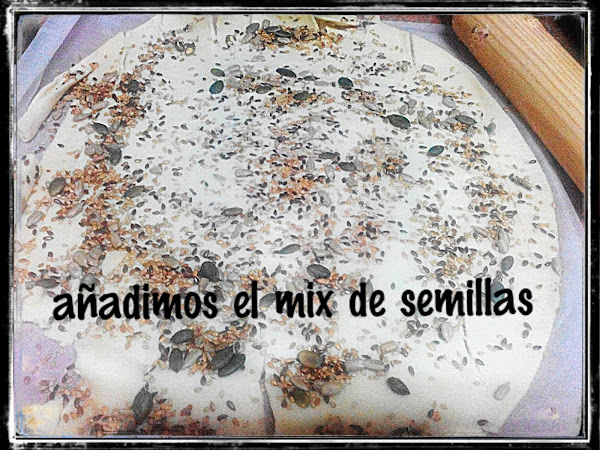 2 . Espolvoreamos con las semillas y pasamos el rodillo para que se incrusten en la masa
