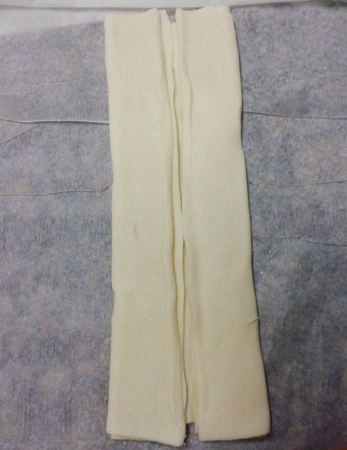 Fold the sides of the dough towards the center so they go halfway to the middle. Sprinkle some more sugar and again use a rolling pin to stick it.