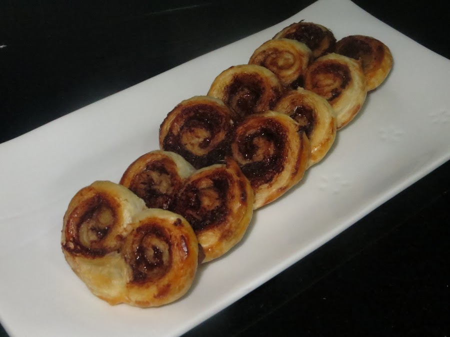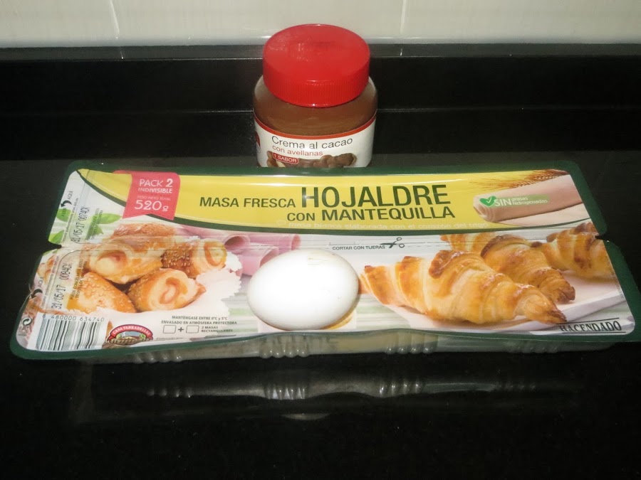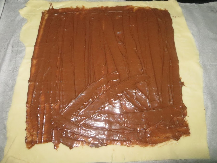 Extendemos la masa de hojaldre sobre la encima, hacemos una señal en la mitad del hojaldre para saber dónde tenemos que doblar. A continuación, ponemos una capa fina de nutella encima del hojaldre. Dejamos unos cuantos centímetros en los bordes para que no se nos salga. Ahora en verano no hace falta porque hace calor, pero si veis que la nutella está un poco dura, la metéis unos segundos al microondas para que sea más fácil manejarla.