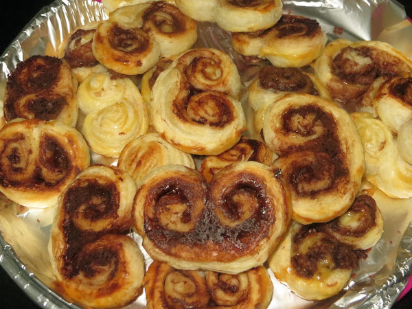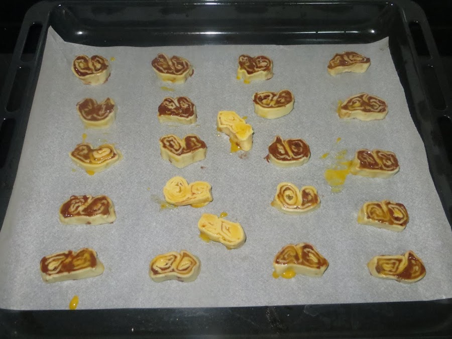 Una vez que tenemos un solo rollo con forma de palmera las vamos cortando con un cuchillo, los extremos los desecháis y si veis que el hojaldre está un poco blando, lo podéis meter un poco al congelador para que se endurezca y cortarlo mejor. Ahora ponéis papel apto para horno en una bandeja y colocáis las palmeras encima dejando hueco entre ellas ya que se expanden. Pintamos con huevo batido y metemos al horno, que previamente estará precalentado a 180º durante 15 minutos o hasta que estén doradas. Las sacamos, las dejamos enfriar y ya están listas para degustar.