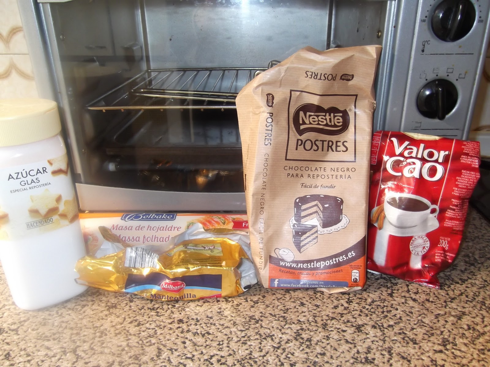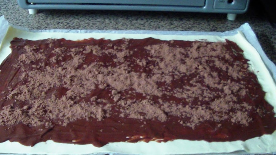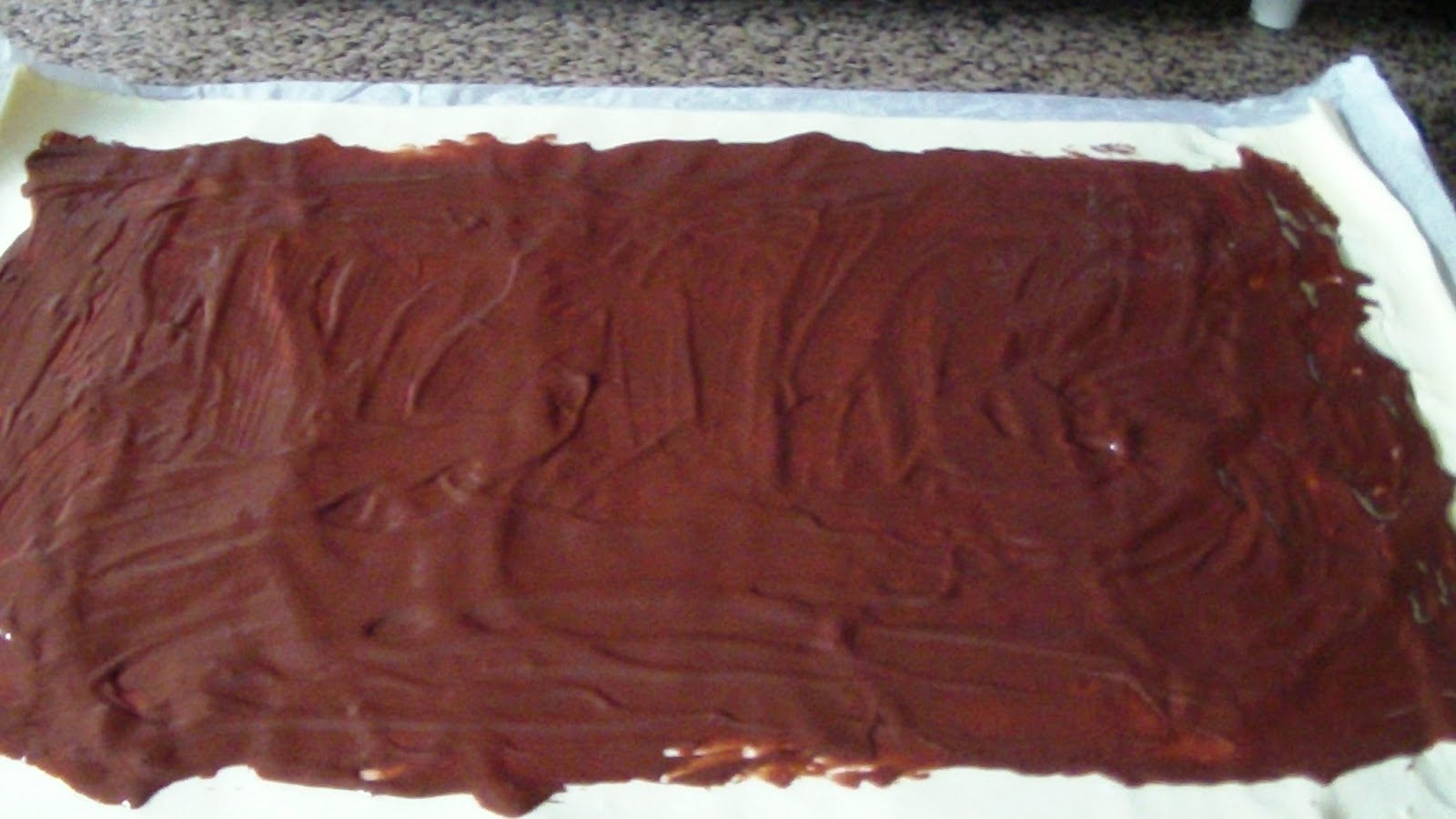 Lo primero que hacemos es sacar la masa de hojaldre de la nevera y la estiramos bien, luego metemos el chocolate fondant al microondas y lo fundimos a baja potencia con la mantequilla. Ahora con parte de ese chocolate untamos una capa muy fina de chocolate y le echamos el cacao por encima.