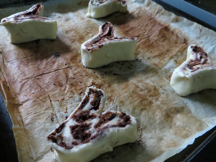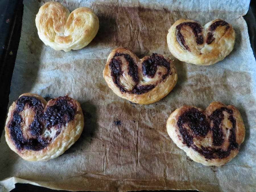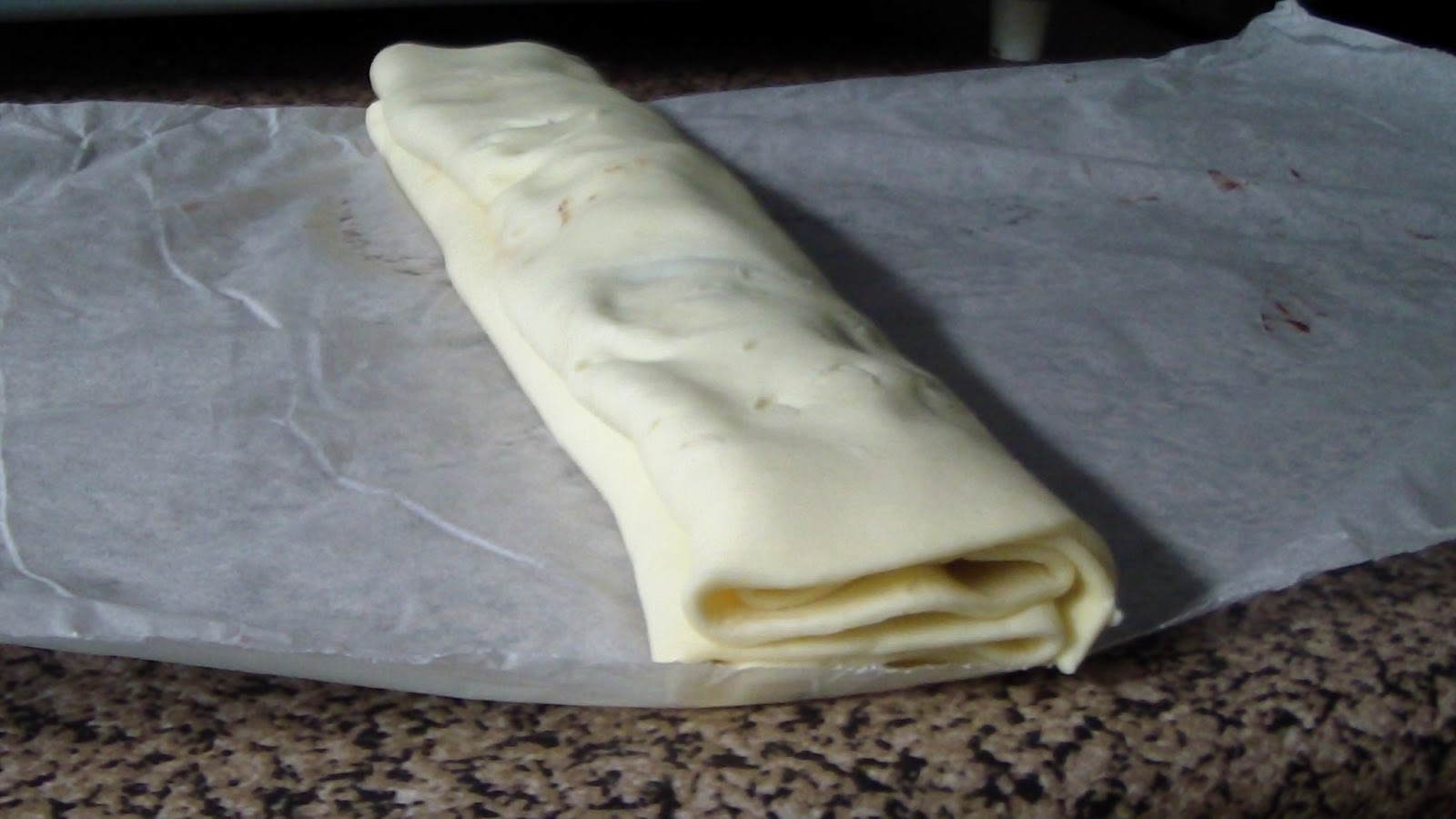 Tras este paso llega el momento de enrollar el hojaldre, los pasos son los mismos que he utilizado en las palmeras que he cocinado con anterioridad. Se va doblando desde cada uno de los extremos hasta que queda sólo un doblez. Daros cuenta que como van rellenas de chocolate van a quedar más gordas que las que hice sólo de azúcar y también van a crecer más en el horno, por eso no las debéis poner muy juntas.