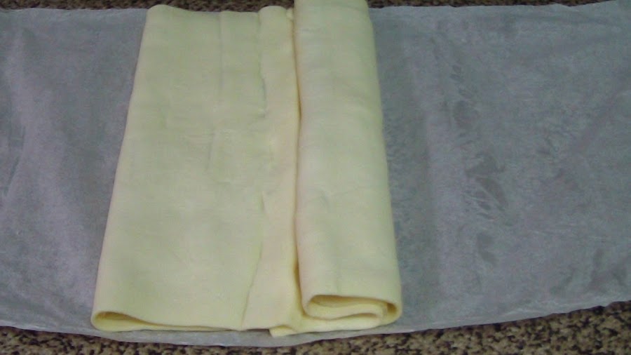Ahora vamos doblando los extremos hasta la mitad de la masa como podéis ver en las fotografías paso a paso. Hay gente que decide enrollarlas, pero yo lo veo algo más complejo, así que las voy doblando hasta que se me queda en un solo rollo con forma de palmera. Entonces se pinta con huevo batido y se espolvorea con un poco de orégano.