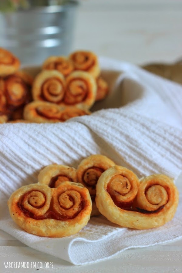 Cuando estaba de baja maternal (hace casi dos años), al mediodía ponía el programa de TV "La mañana de la 1", sólo para ver la sección de cocina de Sergio Fernández. La de recetas que anoté en mi libreta! Y estas palmeritas son parte de ellas. Y las he hecho unas cuantas veces, porque en casa nos encantan, y recurro también a ellas cuando tengo que llevar algo para un día de campo, como aperitivo, a una merienda del cole, y hasta las puse en la Mesa Dulce del cumpleaños de mi hijita (para dar un toque salado con pinta de dulce... a todo el mundo le sorprendió y gustó).