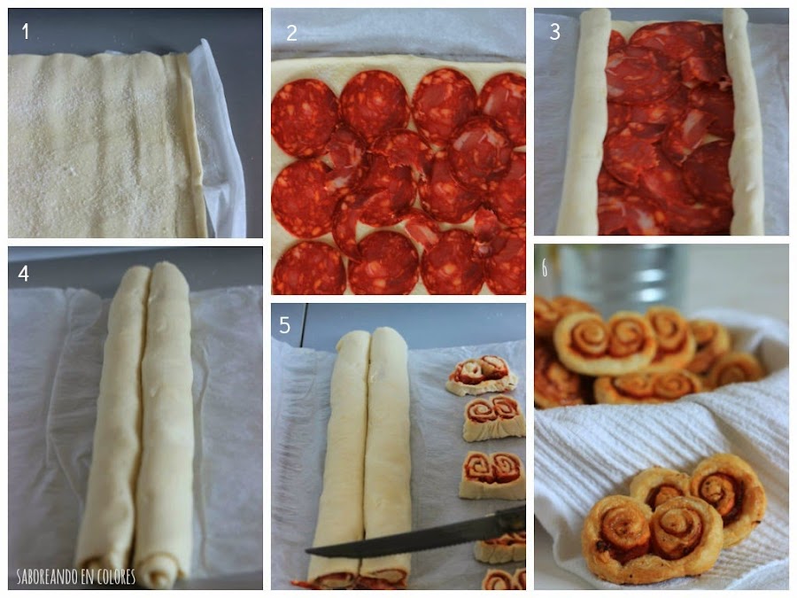 ? Colocad una sola capa de lonchas de chorizo. No exageréis poniendo demasiado porque luego es más difícil mantener la forma de la palmerita.