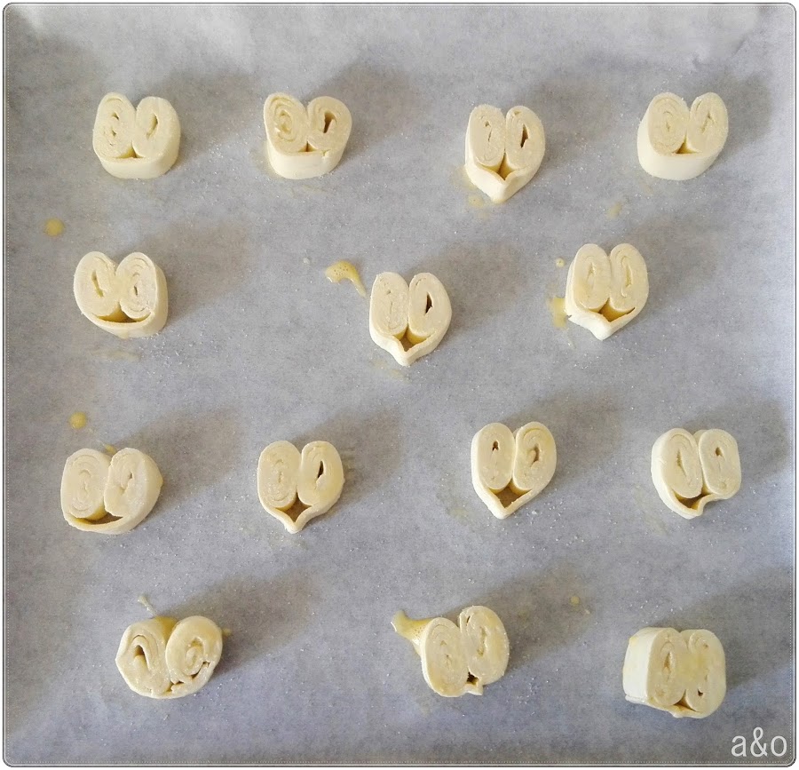 Segundo. Colocamos los trozos encima de la bandeja del horno y batimos el huevo con el que pintaremos las palmeritas para que cojan una tonalidad apropiada. Luego las metemos en el horno a 180º tanto por arriba como por abajo. El tiempo es lo de siempre, depende de cada horno, así que estad atentos.